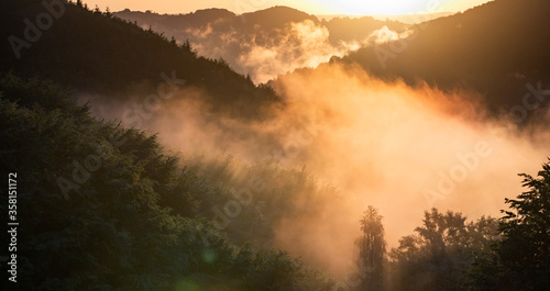 Fototapeta premium epic summer panorama of foggy sunset in mountains