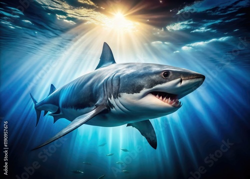 Fototapeta premium Epic underwater adventure: Photograph majestic great white sharks in their...