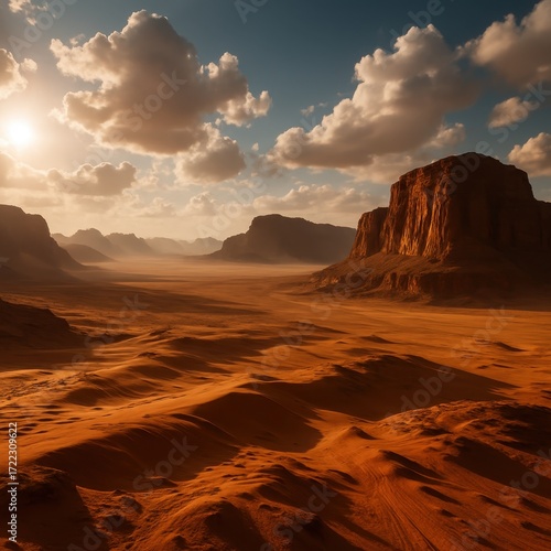 © Bijac, Naklejka premium Epic Wadi Rum desert panorama with towering sandstone cliffs orange dunes dust haze and dramatic clouds evoking Mars cinematic landscape travel