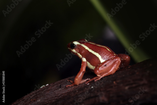 Naklejka premium Epipedobates tricolor closeup from side view on wood, Epipedobates tricolor closeup