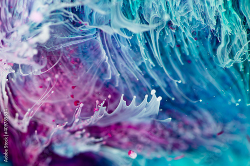 Fototapeta premium Epoxy resin texture with aquamarine, lilac and white colors. Fluid backdrop with splashes and ripples. Abstract frozen artwork with splatter inks. Bright colors mixes on macrophotography picture