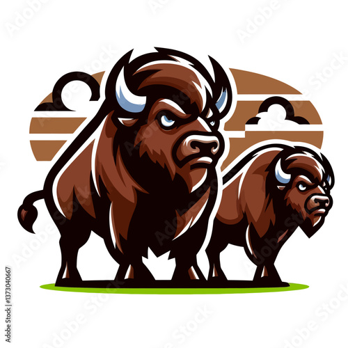 Fototapeta premium EPS10形式のベクターグラフィックで描かれたバイソンの漫画風ロゴ、エンブレムまたはステッカーで、楽しくて親しみやすい、記憶に残る野生動物のデザインのブラ...