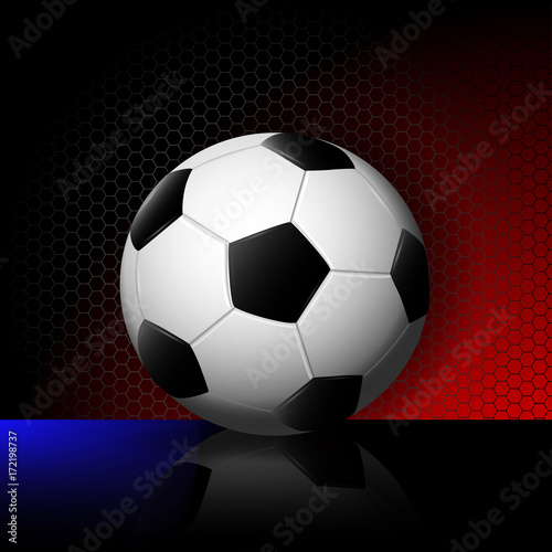 © inartswetrust, Fototapeta premium eps 10 vector 3d football ball isolated on football net background with mirror reflection. Russian flag colors. Editable sport poster for web, print. Russia World Soccer 2018 advertising sport banner