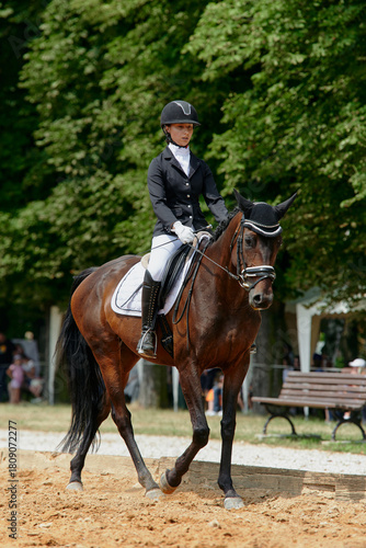 Obraz premium Equestrian sport, horse and rider in dressage competition, woman riding horse in outdoor arena, training and performance, equine event, sunny day, natural light, action shot.