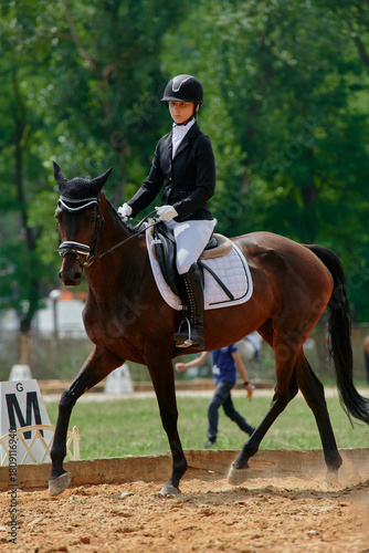 Obraz premium Equestrian sport, horse and rider in dressage competition, woman riding horse...
