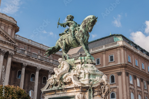 © alesinya7, Fototapeta premium Equestrian statue of Prince Savoyai Eugen in front of the historic Royal Palace in Buda Castle. Budapest