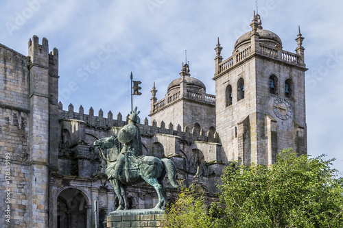 Fototapeta premium Equestrian statue of Vimara Peres next to Porto Cathedral (Se do Porto). Vimara Peres was a IX century nobleman from Kingdom of Asturias and first ruler of the County of Portugal. Porto, Portugal.