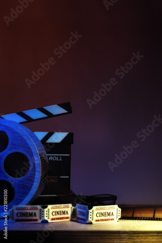 Fototapeta premium Equipment and elements of cinema with dark blue background vertical