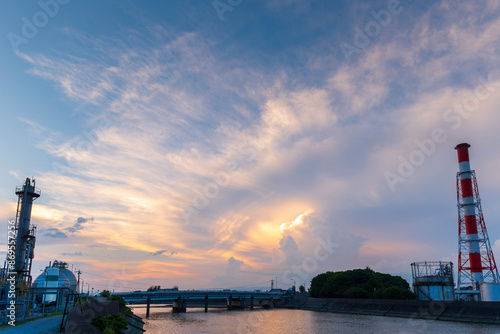 © lukyeee_nuttawut, Naklejka premium Equipment of gas oil refining plant in Japan industrial factory area with sunset or sunrise sky background view from Fishing port, Yokkaichi, Mie Prefecture, Japan.