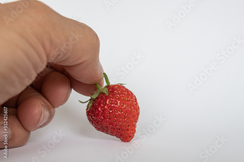 © Tobias, Obraz premium Erdbeere in der Hand isoliert auf weiß