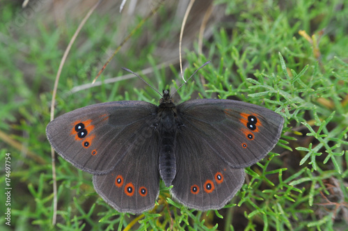 © Ivan, Fototapeta premium Erebia ottomana, Ottoman Brassy Ringlet, red spotted butterfly in grass