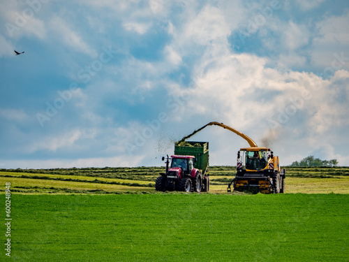 © focus finder, Fototapeta premium Erntemaschienen sammeln Gras auf einer frisch gemähten Wiese