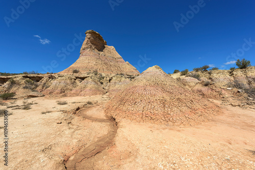 Fototapeta premium Eroded rock and mud formations in the Los Monegros desert, Huesca under an intense blue sky