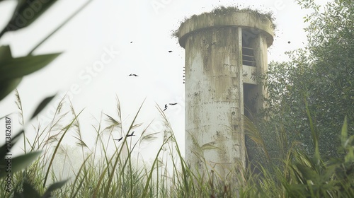 © Jakkarin, Fototapeta premium Erosion of Time: Decaying Water Tower in Tall Grass with Nesting Birds - Symbol of Passing Years and Nature's Reclamation