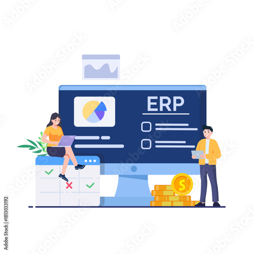 © songo_, Obraz premium ERP enterprise resource planning concept, company productivity and improvement. flat vector illustration on a white background.