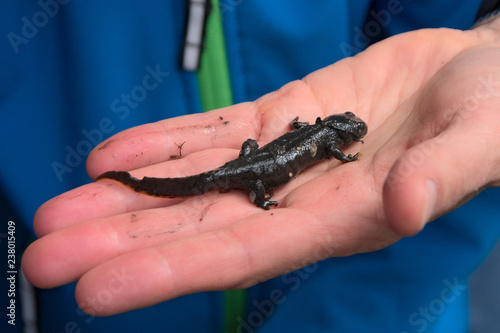 © sunakri, Obraz premium Erschöpfter Molch wird nach Teichsanierung wieder in seinen Tümpel freigelassen und schwimmt davon