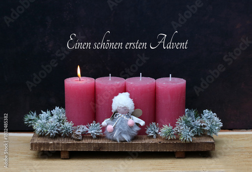 © Racamani, Obraz premium Erster Advent: Adventsdekoration mit rosa Adventskerzen und einer kleinen sitzenden Puppe. Über dem Arrangement steht der Schriftzug Einen fröhlichen ersten Advent.