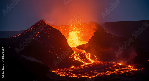 © Asmarajun, Fototapeta premium Erupting Volcano at Night, Hot Lava Flowing
