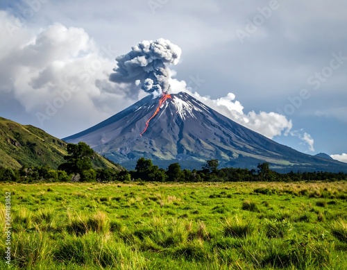 © kurang, Fototapeta premium Erupting volcano over grassy plain