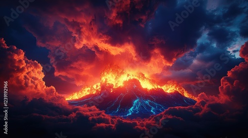 © Panupong, Fototapeta premium Erupting Volcano under Dramatic Sky with Fiery Lava and Clouds