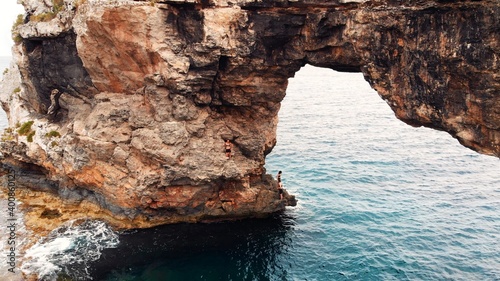 Obraz premium Es Pontas, turist climbling on Natural Rock Arch At The Coast Of Majorca...