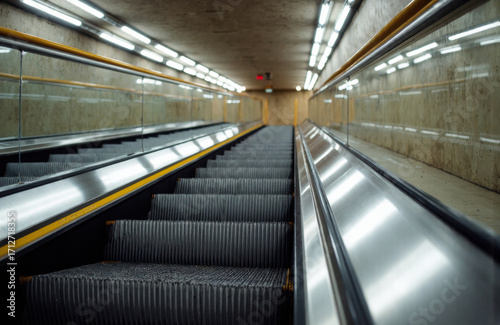 Fototapeta premium Escalator descending in underground subway station with illuminated ceiling...