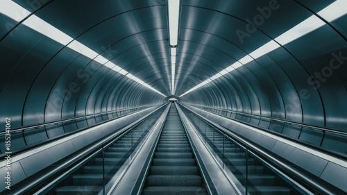 © tilialucida, Naklejka premium Escalator in a sleek, futuristic tunnel with symmetrical lines and blue tones. highlights modern transportation, urban design, and architectural aesthetics.