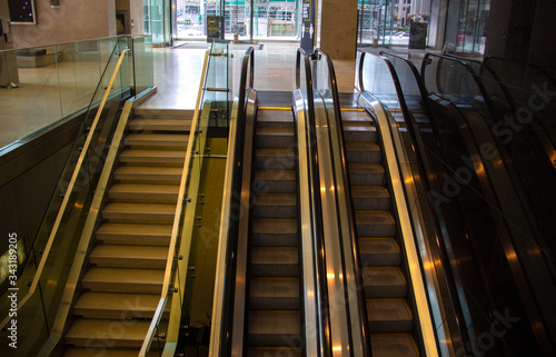 Obraz premium Escalators in an empty office lobby