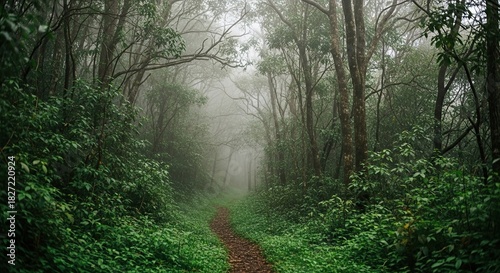 Fototapeta premium Escape into enchanting misty woods with a winding path, offering serenity and adventure, perfect for travel blogs, nature documentaries, and calming visuals