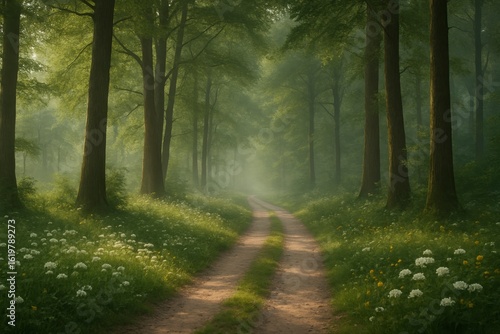Fototapeta premium Escape to this enchanting forest path with dappled sunlight and wildflowers...