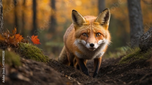 Fototapeta premium "Escena forestal otoñal con un zorro parcialmente oculto, destacando la...