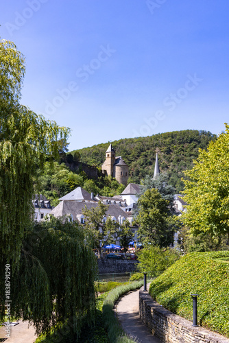 © Bjorn B, Fototapeta premium Esch-sur-Sure, Wiltz, Grand-Duche de Luxembourg, September 07, 2025, Quiet walk past greenery, Slightly inclined route towards charming town square surrounded by nature and local life