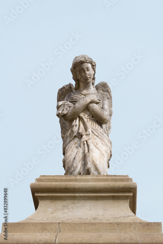 © Vanruve, Fototapeta premium Escultura en marmol de un ángel arrodillado orando con el cielo de fondo