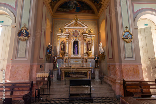 Fototapeta premium Esculturas na lateral - SÃO PAULO, SP, BRAZIL - JUNE 01, 2024: Beautiful sacred art sculptures from the Nossa Senhora da Expectação do Ó Church, with emphasis on Our Lady of Sorrows in the center.