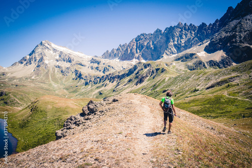 Fototapeta premium Escursionista cammina in montagna