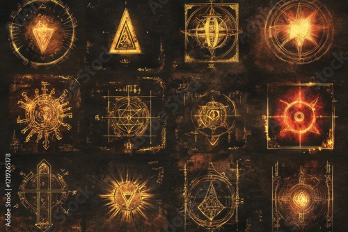 Naklejka premium Esoteric manuscripts featuring glowing glyphs in goldblackred style