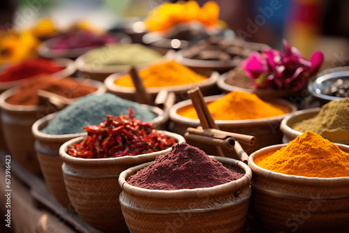 © VicPhoto, Fototapeta premium Especias de multiples colores en sacos, tarros y cajas viejas