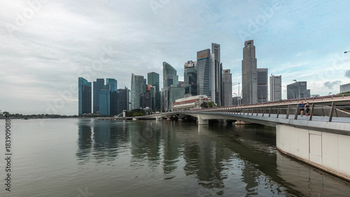 © HyperlapsePro, Naklejka premium Esplanade bridge and downtown core skyscrapers in the background Singapore night to day timelapse