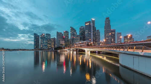 Naklejka premium Esplanade bridge and downtown core skyscrapers in the background Singapore night to day timelapse