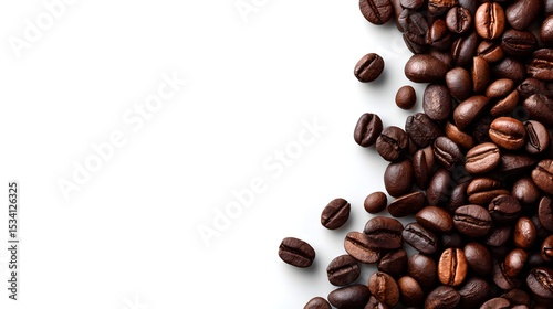 Naklejka premium Espresso beans in a dark roast cascade, forming a textured wave along a clean white background, creating a visually appealing coffee bean surf effect.