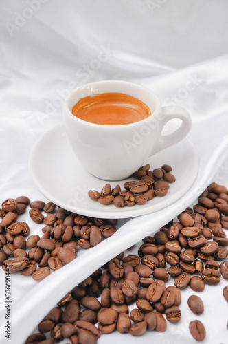 Fototapeta premium Espresso coffee and coffee beans on a white background