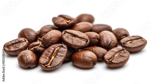 Naklejka premium Espresso coffee beans in closeup on a white background for a vibrant morning...