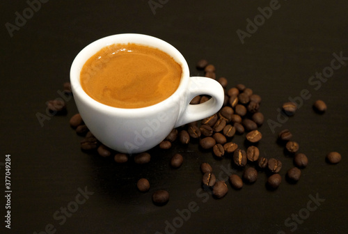 Fototapeta premium Espresso coffee in a white mug and coffee beans on the table.