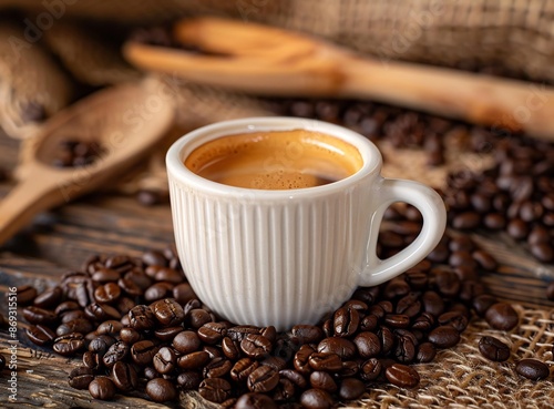 Fototapeta premium Espresso Cup with Crema on Coffee Beans Rustic Background