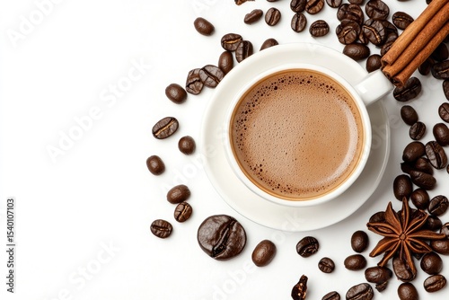 © Abdul, Fototapeta premium Espresso in white cup, coffee beans, cinnamon, anise