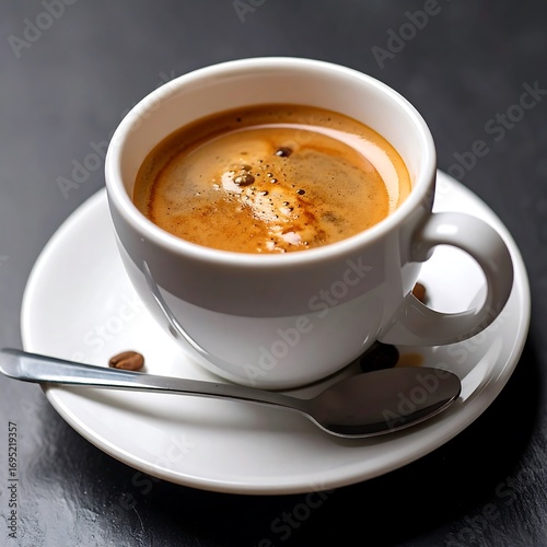 © Anggitacs, Obraz premium Espresso in white cup on dark background