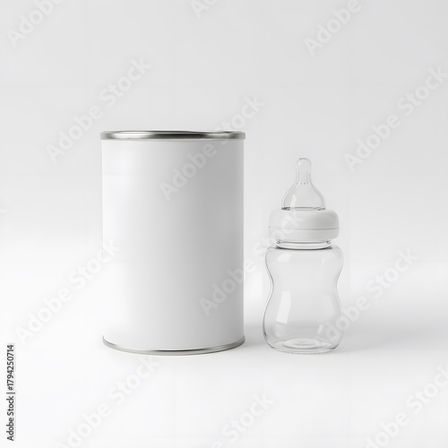 Obraz premium Essential Baby Supplies Formula Can & Bottle on White Background
