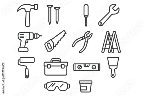 Fototapeta premium Essential hand tools icons set: hammer, drill, wrench, ladder, toolbox