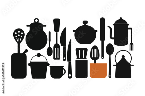 © MdRanju, Fototapeta premium Essential kitchen tools silhouette vector collection.
