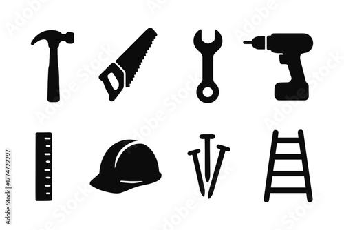 Fototapeta premium Essential silhouette icons of construction tools for modern projects